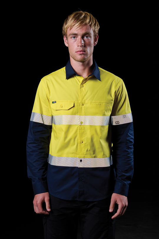 FXD LSH.4T TAPED HI-VIS VENTED STRETCH LONG SLEEVE WORK SHIRT IS BUILT USING A DURABLE 150GSM LIGHTWEIGHT STRETCH RIPSTOP AND FEATURES A MESH COOLING VENT AT BACK YOKE FOR IMPROVED AIRFLOW AND SEGMENTED REFLECTIVE TAPE IN HOOP PATTERN.