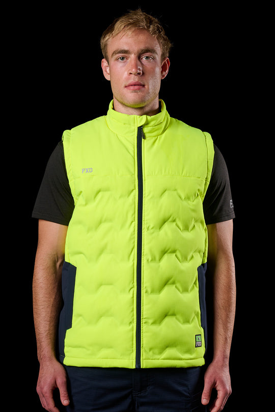 THE FXD WO.6 INSULATED HI-VIS PUFFER VEST IS A HIGH-PERFORMANCE OUTERWEAR WORK VEST BUILT USING T800 STRETCH POLYESTER RIPSTOP WITH A PFAS-FREE WATER REPELLENT FINISH AND FEATURES A STITCHLESS BAFFLE DESIGN